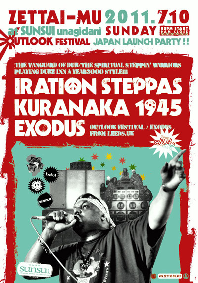 | 2011.7.10 (SUN) *20PM START - 0AM CLOSE ZETTAI-MU OUTLOOK FESTIVAL JAPAN LAUNCH PARTY in WEST JAPAN THE VANGUARD OF DUB!! THE SPIRITUAL STEPPIN’ WARRIORS PLAYING DUBZ INN A YEAR 3000 STYLE!! UK最大のダブの祭典『UNIVERSITY OF DUB』をはじめ『SUBDUB』『Exodus』等のレジテンツを務める ヨーロッパ・トップのルーツ&カルチャー&ダブ サウンドシステム《IRATION STEPPAS》が今年も来日!! 9月にクロアチアで開催されるヨーロッパ最大のベース・ミュージック&サウンドシステム・カルチャーの祭典 『OUTLOOK FESTIVAL』のジャパン・ローンチ・パーティーとして、首謀者《EXODUS》も来日決定!! |