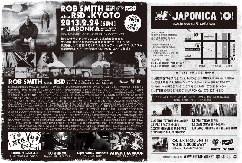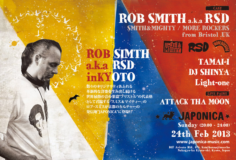 2013.2.24 (SUN) ROB SMITH a.k.a RSD in KYOTO :: CAST :: RSD a.k.a ROB SMITH TAMAI-I a.k.a DJ A.I (NIGHT TIME HIGH/ANGEL) DJ SHINYA (Japonica / NNNF / BUTTER) Light- one a.k.a dimness (Worm / NIGHTLIFE) :: Live paint :: ATTACK THA MOON (NIGHT TIME HIGH) @ JAPONICA music store & cafe bar ADDRESS:京都市中京区寺町通御池上ル上本能寺前町476 アシストビルB1 TEL:075-211-8580 WEB SITE:http://www.japonica-music.com WEB SITE:http://www.japonica-cafe.com/ OPEN 20:00 - CLOSE 24:00 ADV. 1,500yen / DOOR 2,000YEN (ドリンクチャージ別)