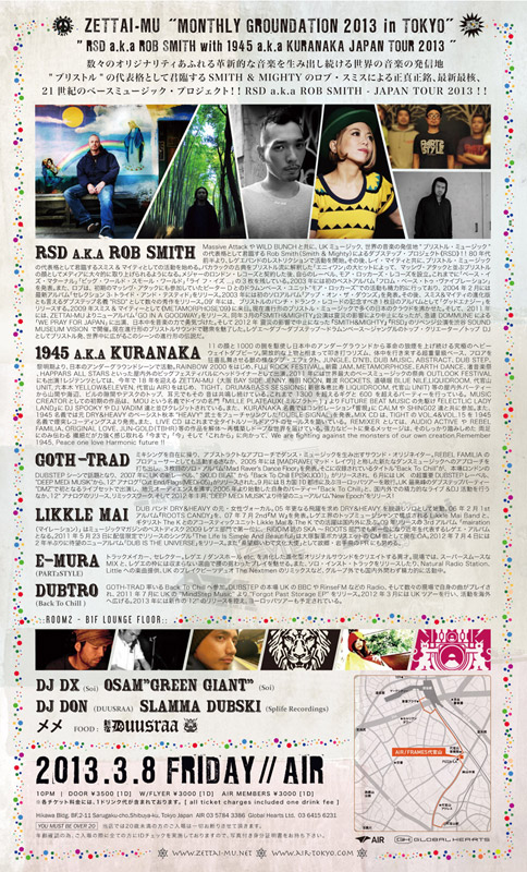 | 2013.3.8 (FRI) ZETTAI-MU“Monthly Groundation in TOKYO" :: MAIN FLOOR :: RSD a.k.a ROB SMITH (SMITH&MIGHTY / MORE ROCKERS from BRISTOL.UK) 1945 a.k.a KURANAKA (Zettai-Mu) GOTH-TRAD (DEEP MEDi / BACK to CHILL) LIKKLE MAI e-mura (PART2STYLE SOUND) DUBTRO (BACK to CHILL / MindStep Music) :: LOUNGE FLOOR :: DJ Dx (Soi) OSAM"GREEN GIANT" (Soi) DJ Don (DUUSRAA) Slamma Dubski (Splife Recordings) メメ FOOD: 新宿ドゥースラー @ AIR Info tel: 03-5784-3386(AIR) ADDRESS: 東京都渋谷区猿楽町2-11氷川ビル B1, B2 WEB SITE : http://www.air-tokyo.com/ OPEN/START. 22:00 DOOR.\3500(1D) w/f \3000(1D) AIR members \3000(1D)