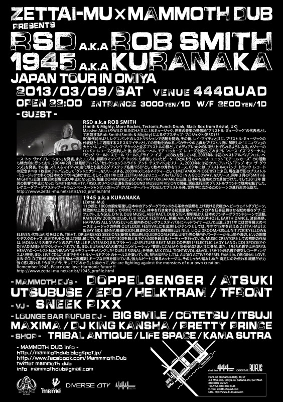 ![]() ZETTAI-MU presents “ RSD a.k.a ROB SMITH & 1945 a.k.a KURANAKA JAPAN TOUR 2013 ” 数々のオリジナリティあふれる革新的な 音楽を生み出し続ける 世界の音楽の発信地"ブリストル"の代表格として君臨するロブ・スミス(スミス&マイティー) に よる 正真正銘、最新最核、21世紀のベースミュージック・プロジェクト!! RSD a.k.a ROB SMITH - JAPAN TOUR 2013!! |
