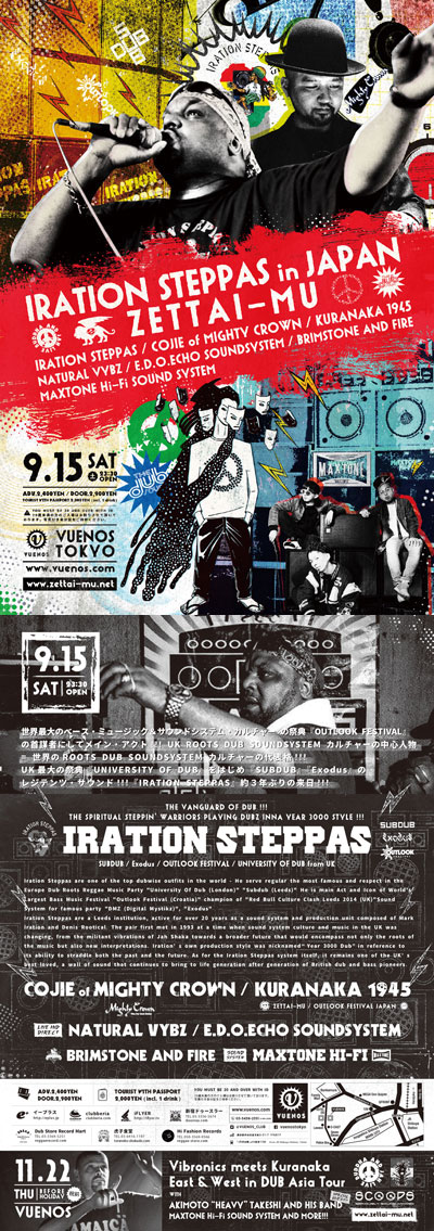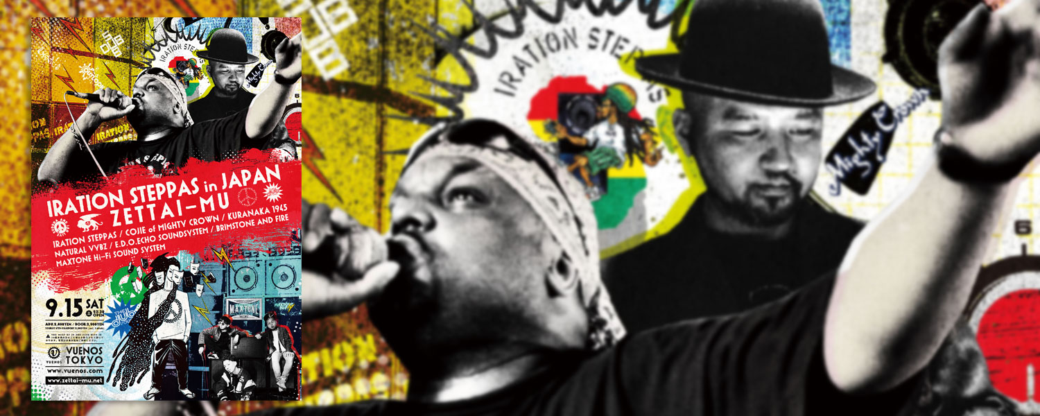 | "IRATION STEPPAS in JAPAN" ZETTAI-MU 2018.9.15(SAT) at VUENOS, Shibuya 世界最大のベース・ミュージック&サウンドシステム・カルチャー の祭典『OUTLOOK FESTIVAL』の首謀者にしてメイン・アクト!!! UK ROOTS DUB SOUNDSYSTEM カルチャーの中心人物 = 世界のROOTS DUB SOUNDSYSTEM カルチャーの代表格!!! UK最大の祭典『UNIVERSITY OF DUB』をはじめ 『SUBDUB』『Exodus』のレジテンツ・サウンド!!!『IRATION STEPPAS』約3年ぶりの来日!!! |
