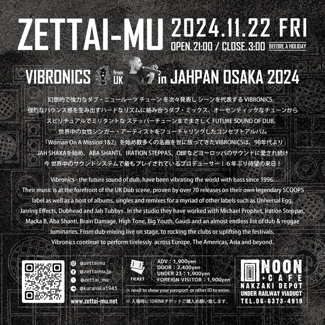 11の顔と1000の腕を駆使しアジアのアンダーグラウンドから革命の狼煙を上げ続ける日本を代表するアーティスト。開放的な上物と相まって叩き打つリズム、体中を行き来する超重量級ベース、フロアを狂喜乱舞させる獣の様なダブ・エフェクト!!四半世紀以上に渡り日本のトップDJ/オーガナイザーとして活躍してきたKURANAKAは、今も尚シーンの最前線を歩み続ける現役のレジェンドだ。特にサウンドシステム・ミュージック、怒りや憤り葛藤 またそれらを享受し生きるエネルギーに溢れた音楽のスペシャリスト。インターネットもSNSも存在しない90年代、UKのサウンドシステムで産まれた「Jungle」「Drum&Bass」「Dubstep」「Dub」「New Roots」と呼ばれる ヨーロッパのサウンドシステム・ミュージックを日本に紹介した立役者であり、国内で産声を上げたインディペンデント・シーンの第一人者。 |