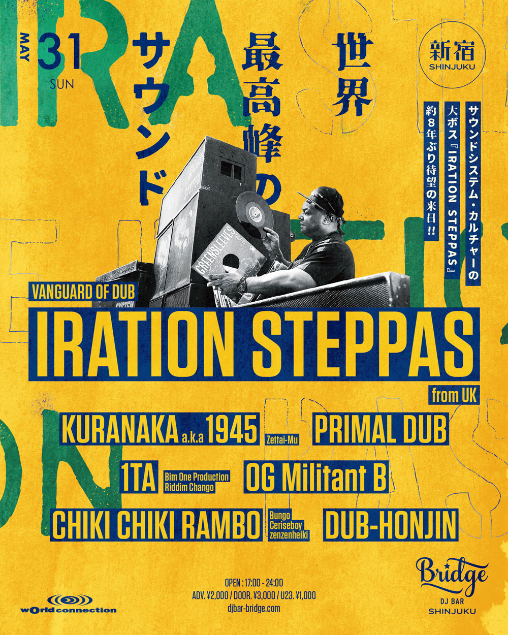 2026.5.31 (SUN) TOKYO wOrld connection x IRATION STEPPAS in JAPAN :: Line-up :: IRATION STEPPAS from UK KURANAKA 1945 (Zettai-Mu) PRIMAL DUB 1TA (Bim One Production, riddim Chango) OG Militant B CHIKI CHIKI RAMBO (Bungo / Ceriseboy / zenzenheiki) DUB-HONJIN @ Shinjuku Bridge ADDRESS : 〒160-0022 東京都新宿区新宿2丁目19-9 角ビル B1 Kado bldg.B1F, 2-19-9, Shinjuku, Shinjuku-ku, Tokyo 160-0022 Japan TEL : 03-6384-1053 VENUE : https://djbar-bridge.com/shinjuku/schedule/world-connection-72/ ZETTAI-MU WEB SITE : https://www.zettai-mu.net/news/2605/irationsteppas OPEN : 17:00 - 24:00 Entrance : ADV. ¥2,000 / DOOR. ¥3,000 / U23. ¥1,000 ▼前売りチケット購入はこちらから (Advance Tickets) https://livepocket.jp/e/wc_iration-steppas ● ZTM HP --- https://www.zettai-mu.net Instagram --- https://www.instagram.com/zettaimu Facebook --- https://www.facebook.com/zettaimu.jp ● Shinjuku Bridge HP --- https://djbar-bridge.com/shinjuku Instagram--- https://www.instagram.com/dj_bar_bridge_shinjuku X--- https://x.com/djbarbridge |